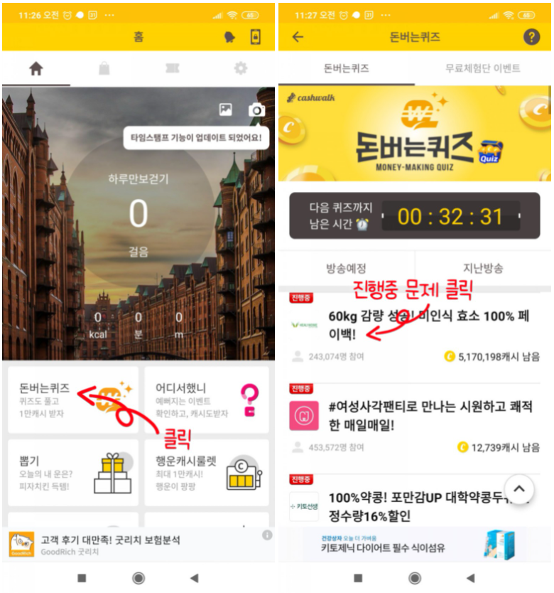 (1) 홈 화면에서 돈버는 퀴즈를 클릭한다.